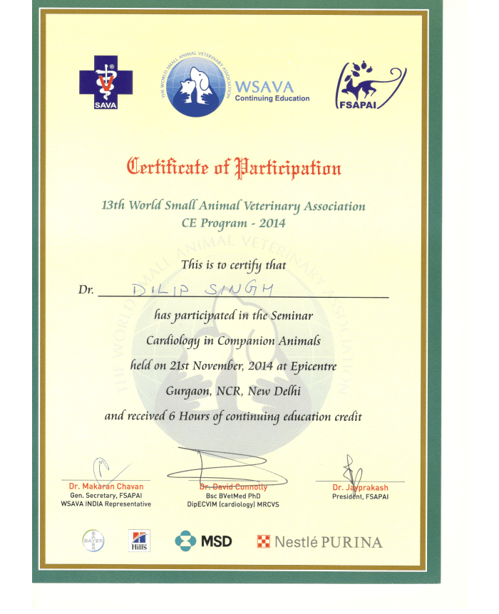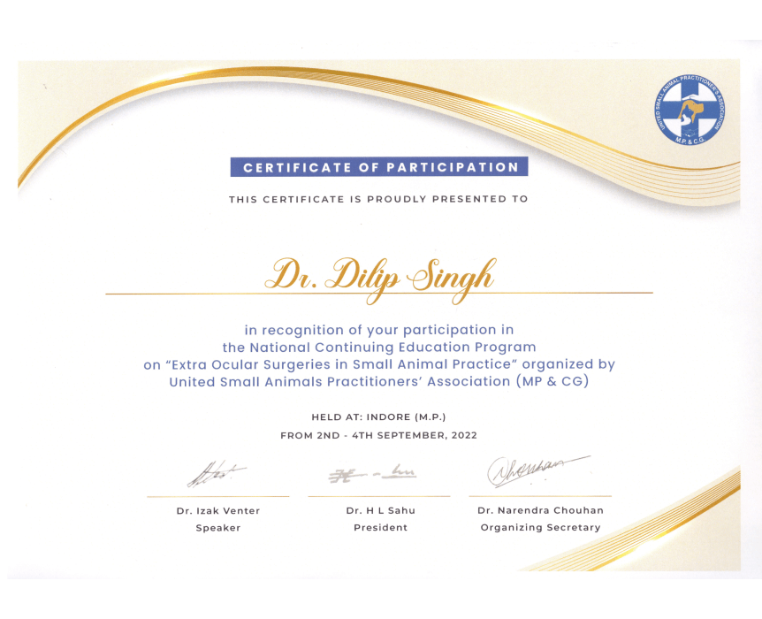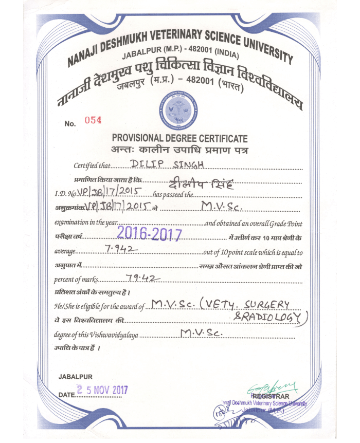M.V.Sc. (Surgery & Radiology) from Nanaji Deshmukh Veterinary & Animal Science University, Jabalpur