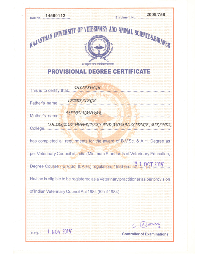 B.V.Sc.&A.H. from Rajasthan University of Veterinary & Animal Science, Bikaner